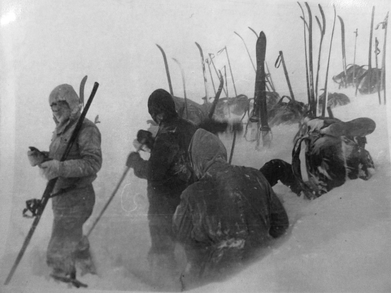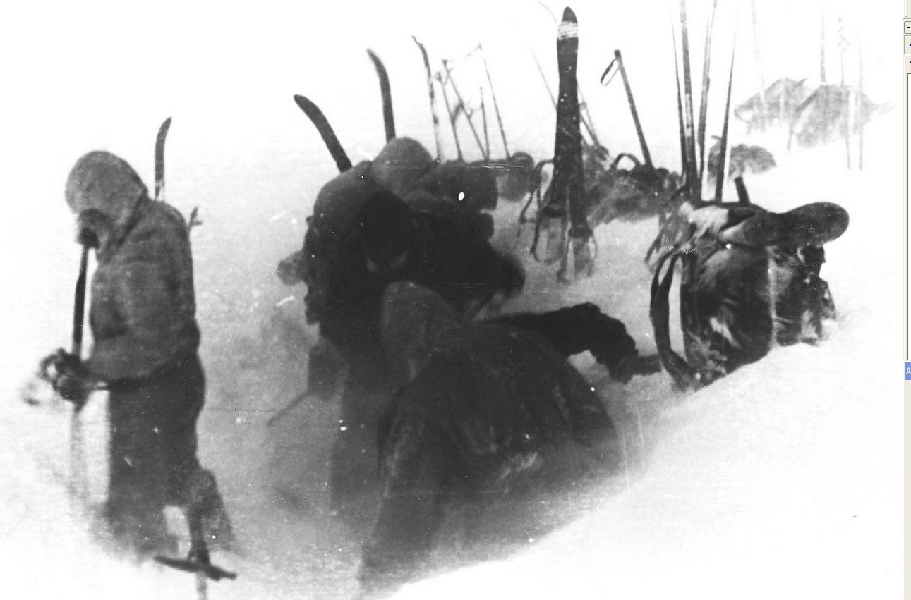 В одном из фотоаппаратов сохранился фотокадр (сделанный последним), на котором изображен момент раскопки снега для установки палатки. Учитывая, что этот кадр был снят с выдержкой I/25 сек., при диафрагме 5,6 при чувствительности пленки 65 Ед. ГОСТ, а также принимая во внимание, плотность кадра, можно считать, что к установке палатки туристы приступили около 5 часов вечера I.II.59 г. Аналогичный снимок сделан и другим фотоаппаратом.