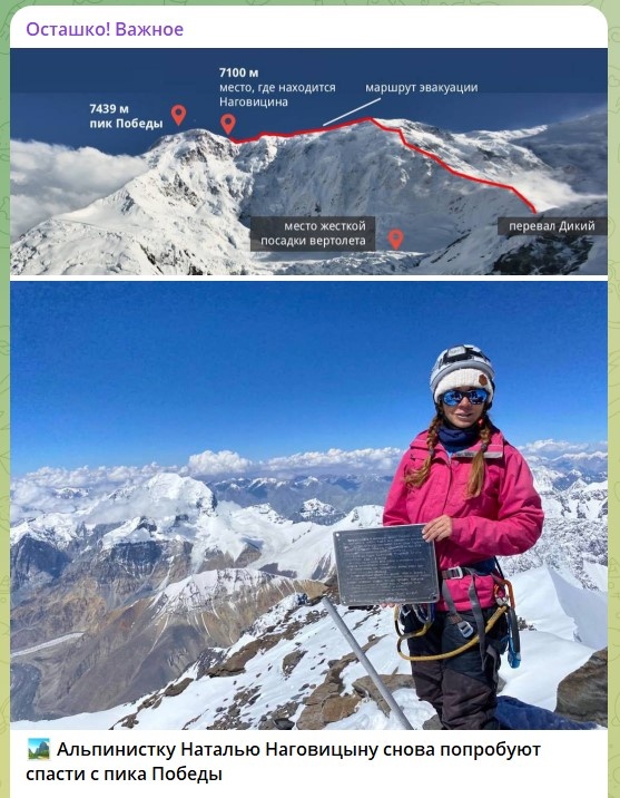 47-летняя Наталья Наговицина сломала ногу при восхождении на одну из самых опасных вершин Тянь-Шань. С 12 августа она находится на высоте 7,2 тысячи метров.