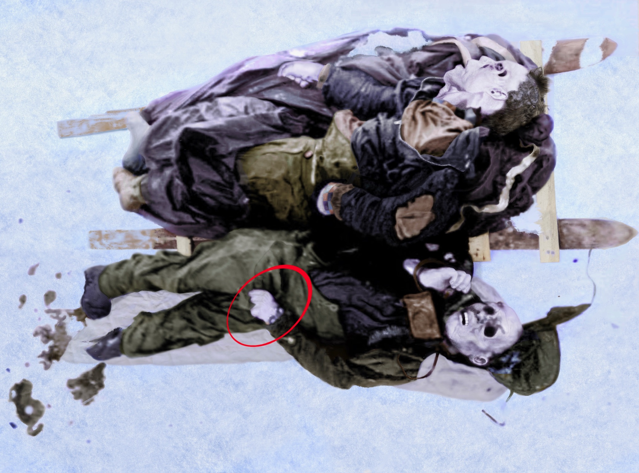Продолжая тему Юры. Присмотритесь насколько тыльная сторона левого предплечья темнее ее внутренней стороны. Также сравните цвет кожных покровов лица Георгия и предплечья Юры (на фото обнаружения они расположены рядом). Контраст очевиден, а цвет внешней стороны левого предплечья Юры сопоставим с цветом левой кисти Георгия, на которой есть ожоговая травма. Теперь внимательно,- под локтевым суставом Юры видны потеки черней жидкости. На фото обнаружения, локтевой сустав виден, и именно в этом месте остался снег. Возможно это и не снег, а лед, который прикрывал место ожога. Черный лёд, возможно что-то похожее кто-то видел на скатах палатки.