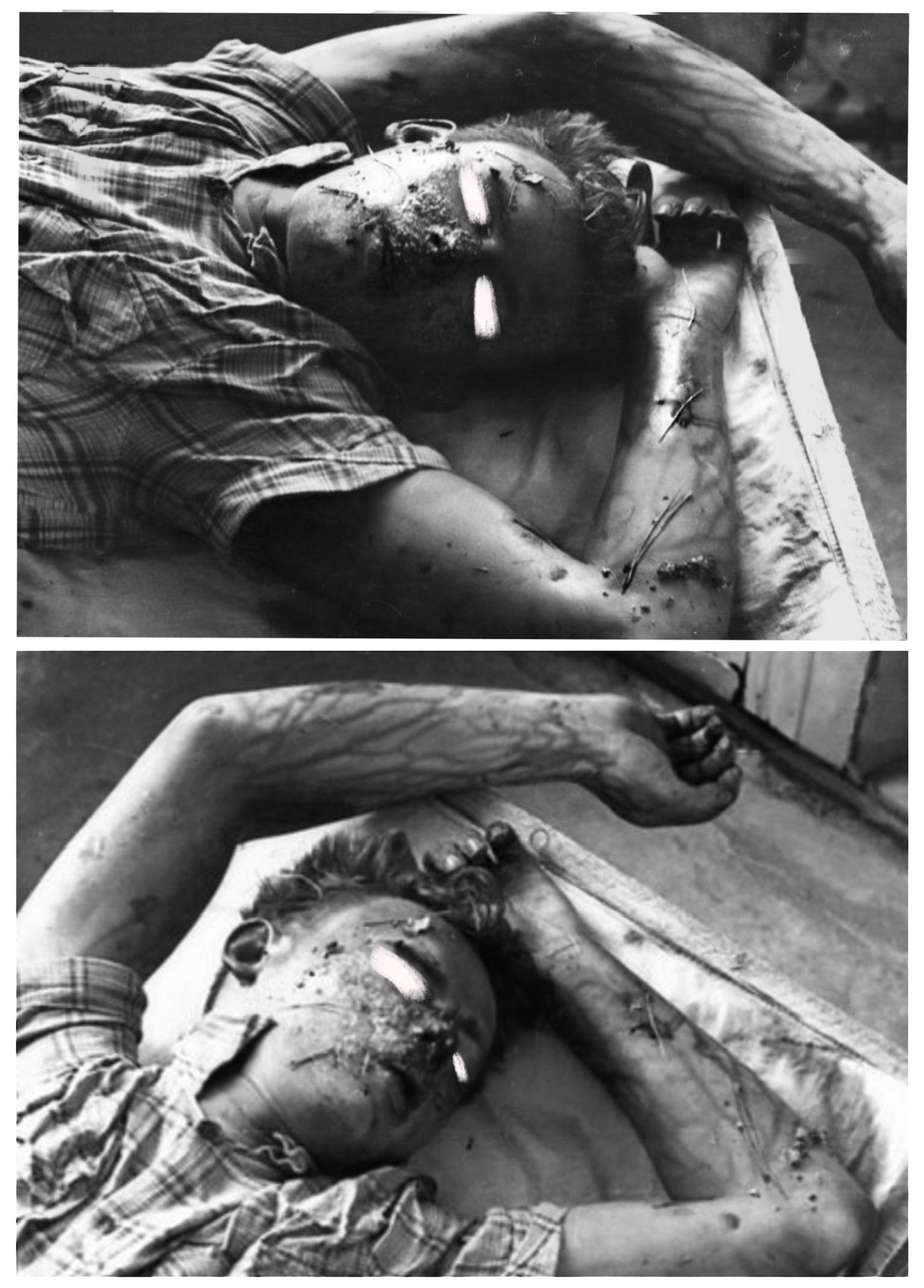 Голова наклонена в левую сторону, но 90% всей массы потёков сосредоточена по центру и на правой половине лица. Чтобы текло к глазам (в правый - слизь, а в левый - кровь, изо рта и носа), а не на подбородок, надо чтобы голова была закинута назад. А ведь на фото при обнаружении под кедром, голова не закинута, она расположена прямо, как на фото обнаружения Рустема.