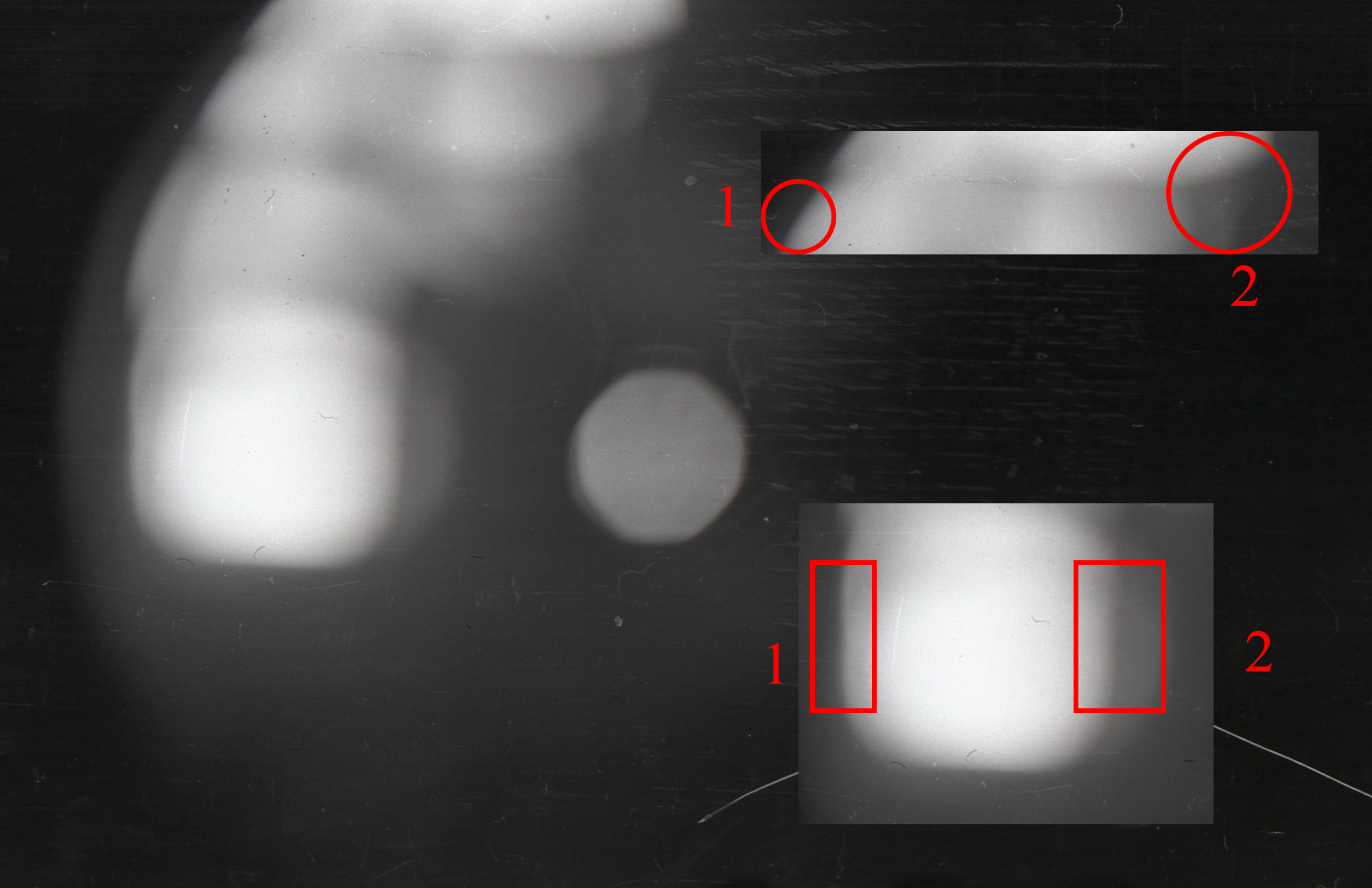 Смотрите переход от темного участка к светлому в области 1 резкий относительно области 2 .Почему я этого не наблюдаю на примерах внизу.Как так получилось объектив же задвинут . Это Вы сказали что шевеленка ,а мне это неизвестно