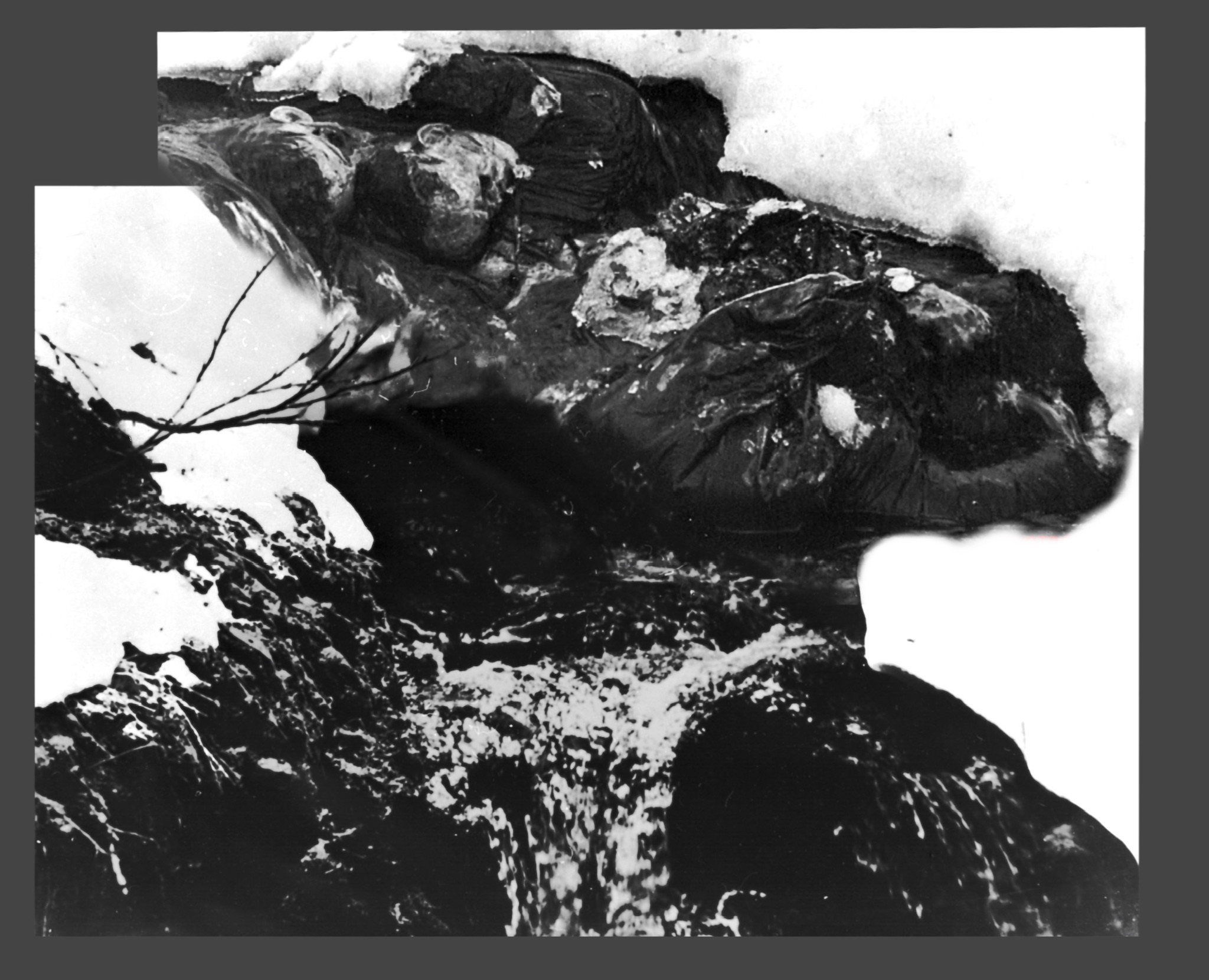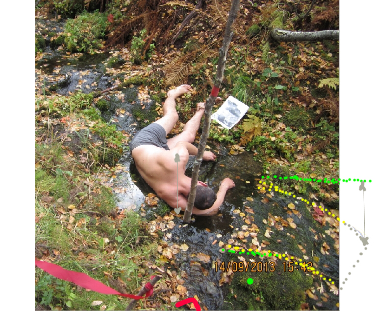 Повторю: на уступе тело теряет точки опоры и зависает над водопадом, т.е. в этом месте оно бы просто упало вниз. Если дерево на склоне присутствовало и в 59-м, то возможно именно оно было препятствием для левой ноги Тибо. Поэтому нога согнута.