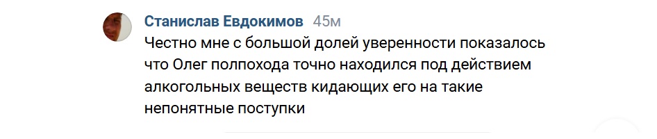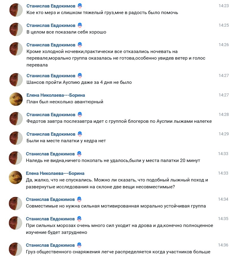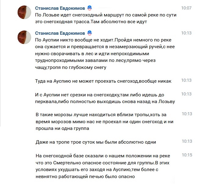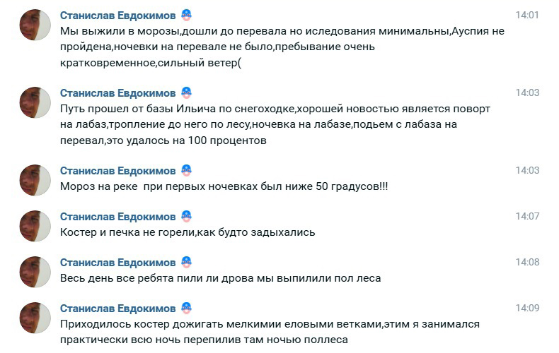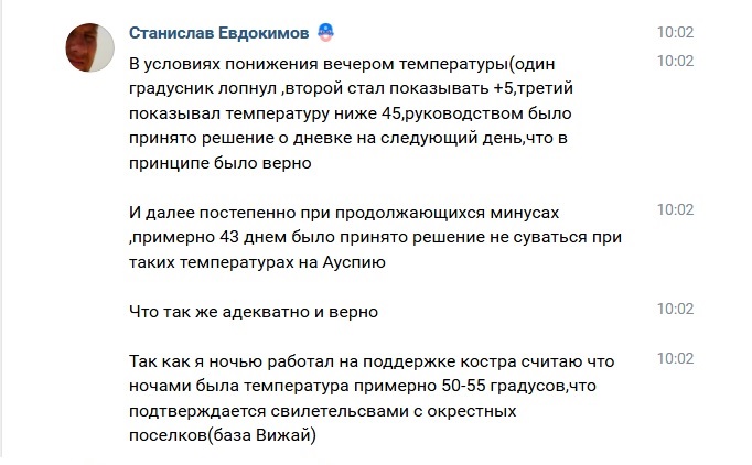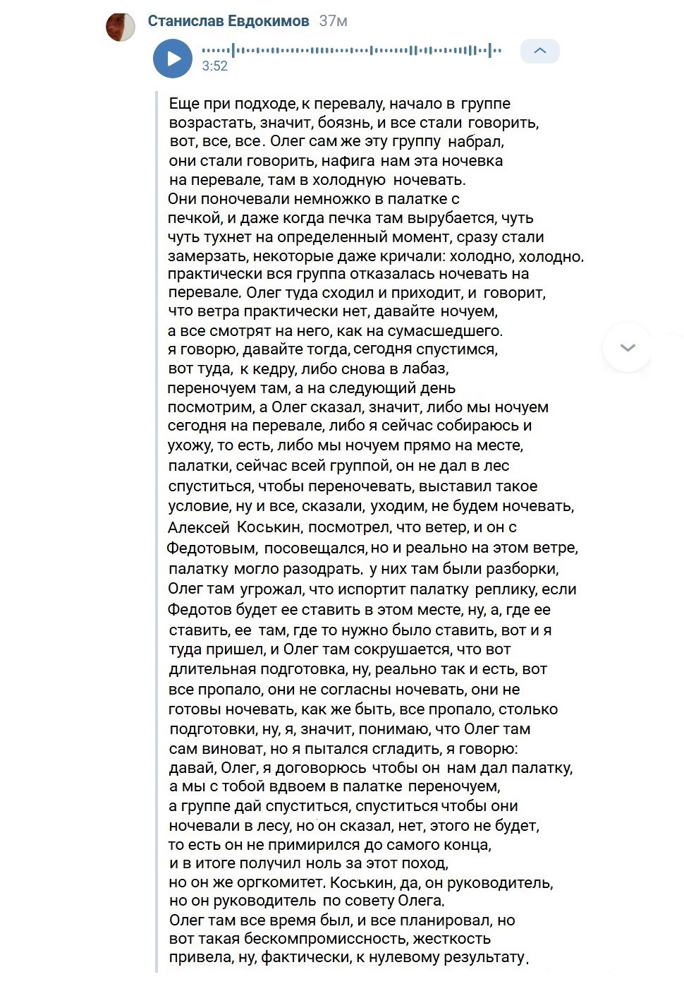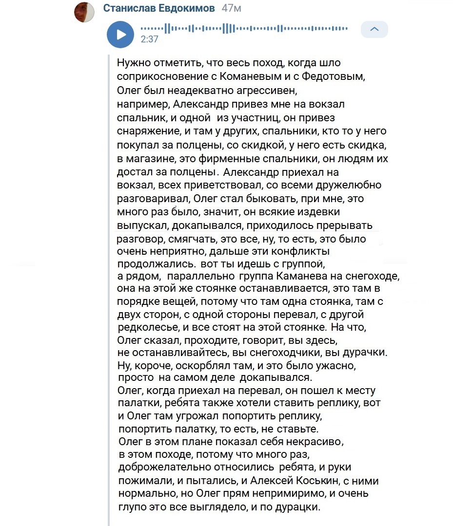 Эти сообщения Стаса Евдокимова, участника экспы-2026 и очевидца событий, взяты из одного из чатов в ВК, где можно общаться и голосовыми сообщениями в том числе. На форуме голосовые сообщения бесполезны, но в ВК предусмотрена авторасшифровка таких сообщений в текстовом формате, такая же как и на ютубе. Если внимательно перечитать, то вполне понятно, о чём он рассказывает. Злоупотребление алкоголем никогда до добра не доводило: истерика на Перевале, попытка порчи чужой палатки, агрессия, и прочие неадекватные поступки - тому подтверждение.