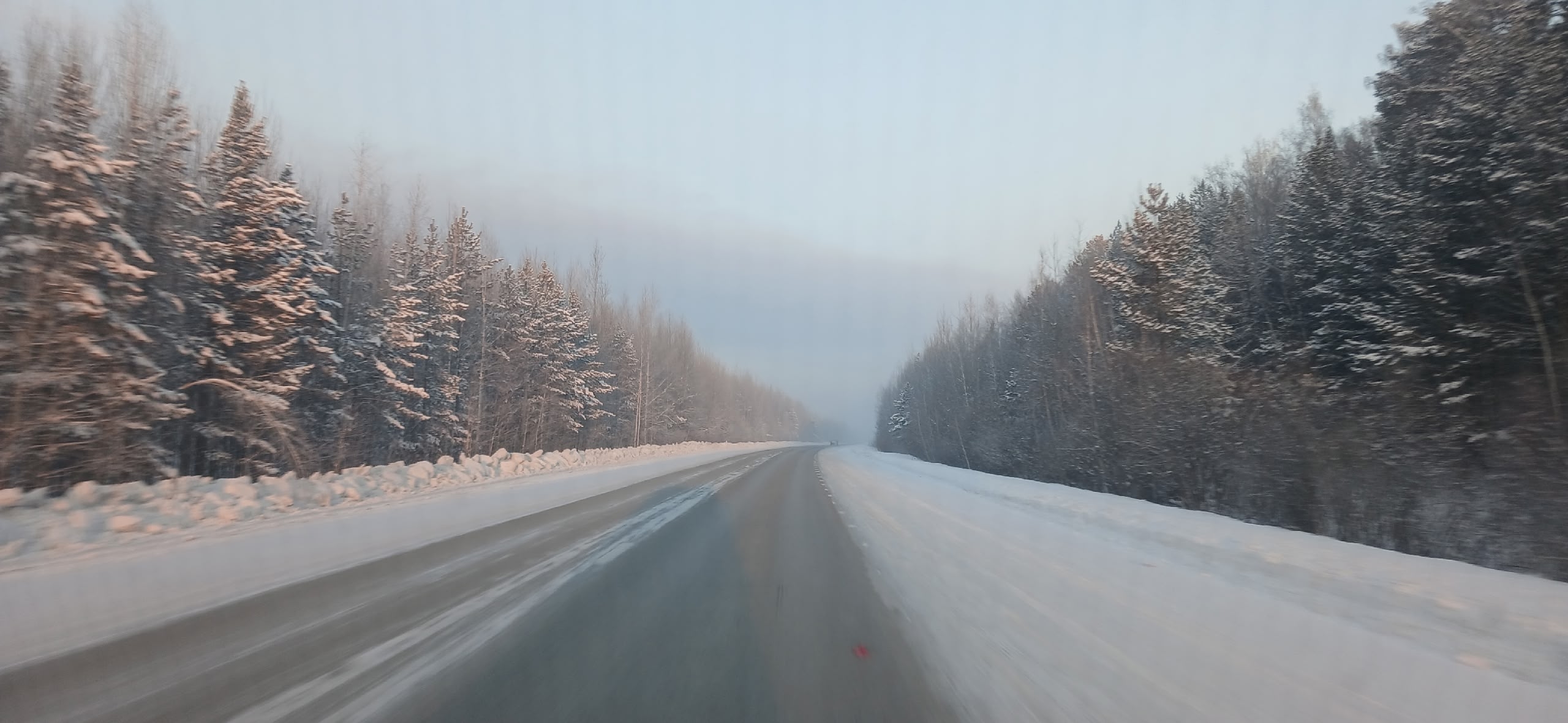 Едем по Серовскому тракту. Температура в машине на полу -18, за бортом -35. Белое безмолвие. Пятница, но машин на дороге почти нет. Делаем предположения, каково сейчас в североуральской тайге.